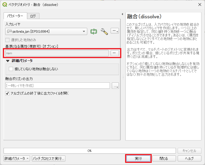 [ベクタジオメトリ – 融合]ダイアログで、以下のように指定し、[実行]する。