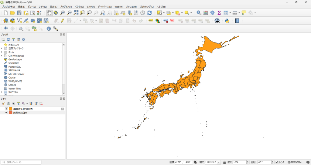 本記事では、QGISを使用して、このシェープファイルを市町村単位から都道府県単位に変更する方法について記載する。