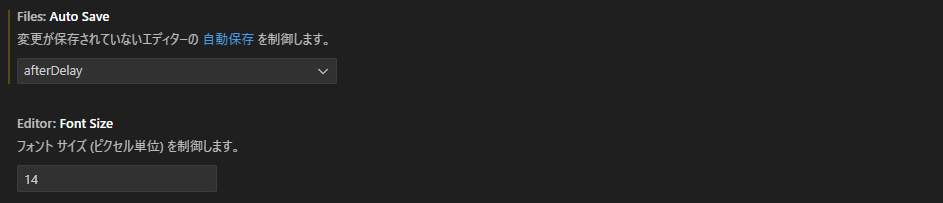 - 変更した項目は、項目の左端に縦線が表示される (下図は、Files: Auto Saveを、off -> afterDelayに変更した時の表示)