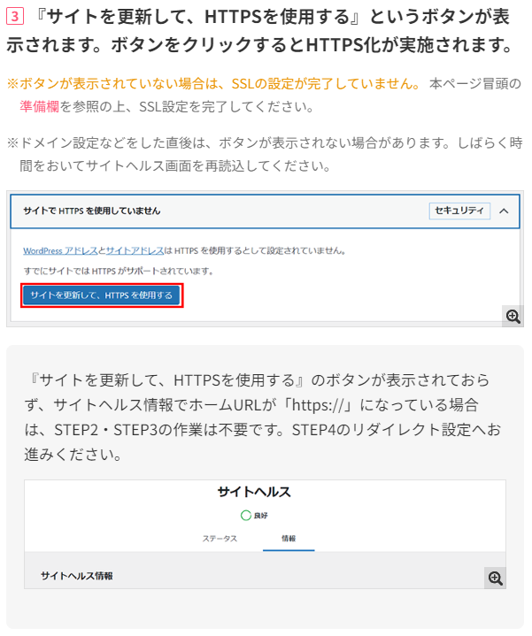 さくらのレンタルサーバで無料SSL (Let’s Encrypt)を設定しWordPressに適用しようとしたが、公式手順-WordPressのサイトをSSL化したいのStep02-3に載っている『サイトを更新して、HTTPSを使用する』というボタンが表示されない。その下に記述がある、”『サイトを更新して、HTTPSを使用する』のボタンが表示されておらず、サイトヘルス情報でホームURLが「https://」になっている場合”にも当てはまらない。